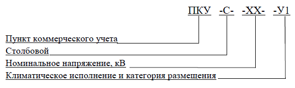 Пример записи условного обозначения ПКУ-С при их заказе и в другой документации ПКУ-С-10-У1 – пункт коммерческого учета столбовой, на номинальное напряжение 10 кВ, климатического исполнения У1.